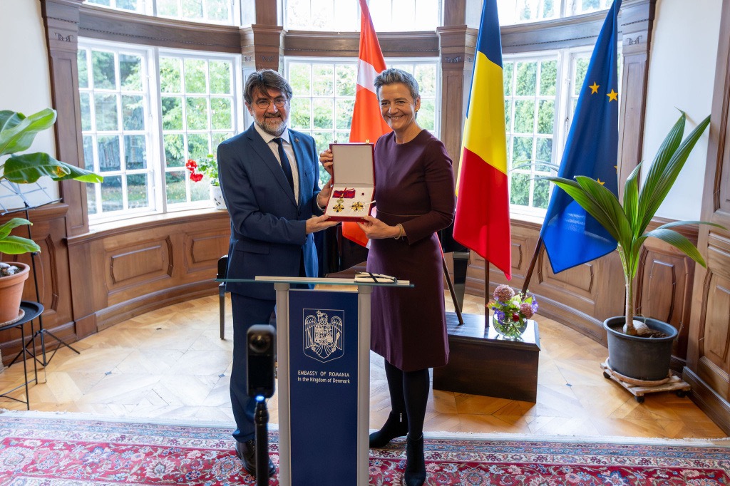 Ms. Margarethe Vestager, a prominent figure in political and academic life in Denmark and Europe, was awarded the National Order “Steaua României” (Star of Romania) in the rank of Grand Officer on behalf of the President of Romania.
