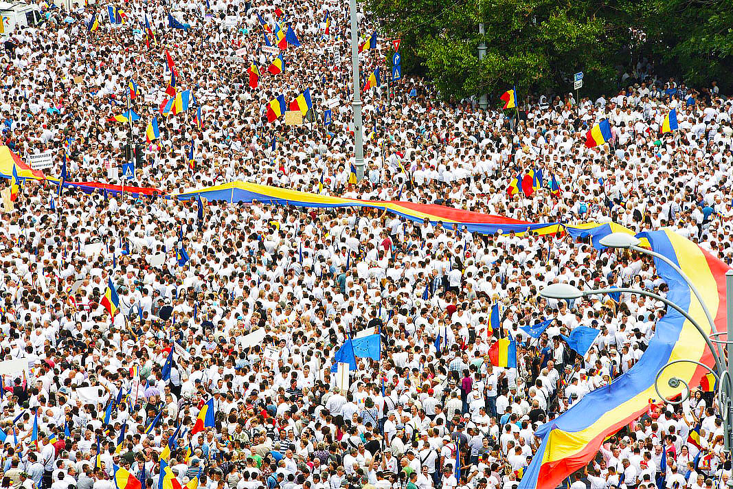 Mit diesen Worten richtet sich der rumänische Senatspräsident Călin Popescu-Tăriceanu an die Menschenmenge, die fast vollständig in weissen Hemden erschienen ist: Als Symbol für den friedlichen Kampf für Gerechtigkeit und Demokratie.